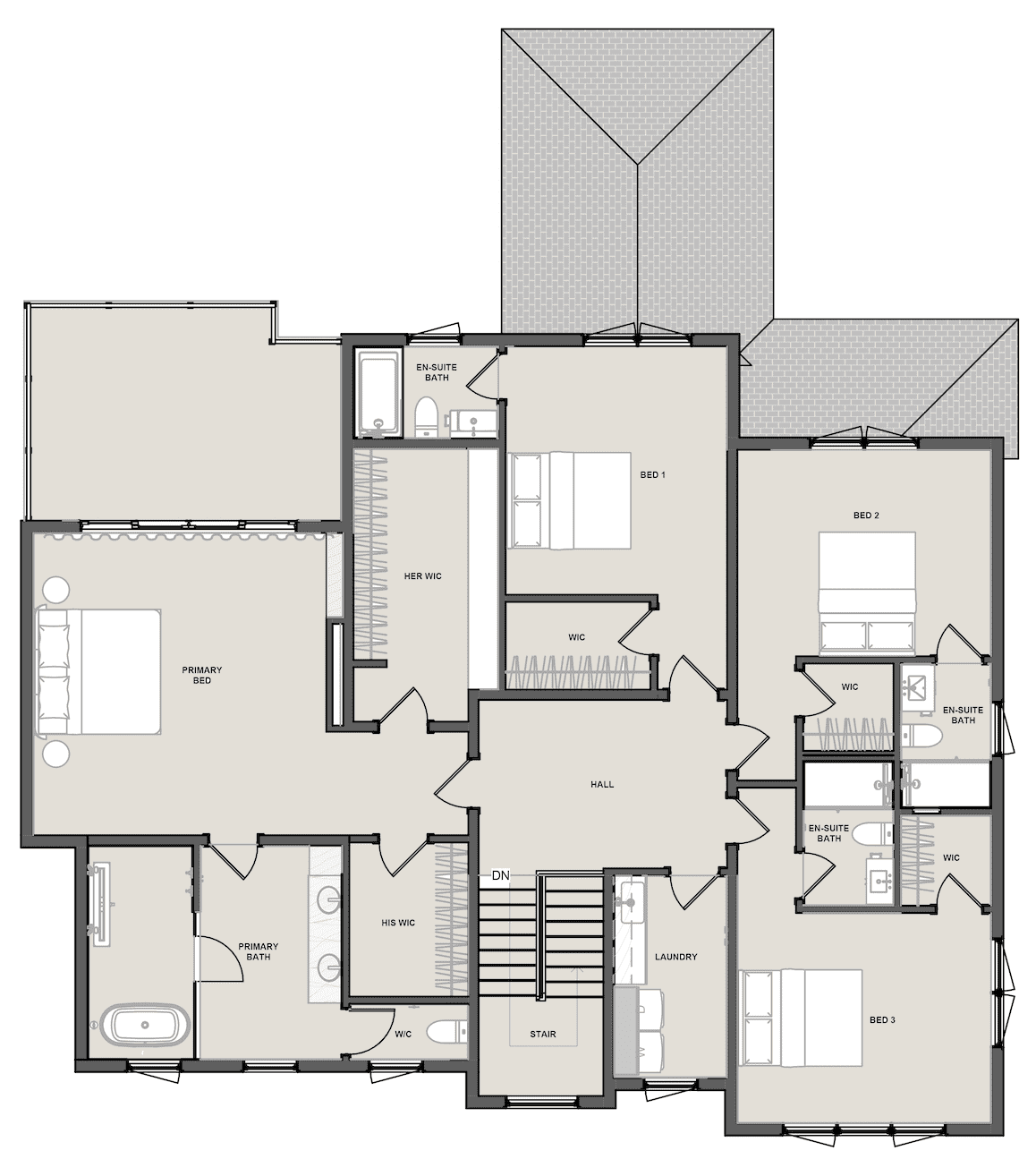 The luxurious master bedroom occupies a central position on this floor, and there are three additional bedrooms with en-suite bathrooms, each designed with comfort and privacy in mind. A laundry room on the second floor adds convenience to everyday life. Two separate walk-in closets. One for him and one for her. Everything has its place.